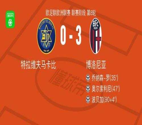 北京时间1月30日欧足联欧洲联赛 联赛阶段 第8轮,特拉维夫马卡比对阵博洛尼亚。博洛尼亚乔纳森-罗破门,奥尔索利尼破门,波贝加破门。最终比分特拉维夫马卡比 0-3 博洛尼亚。